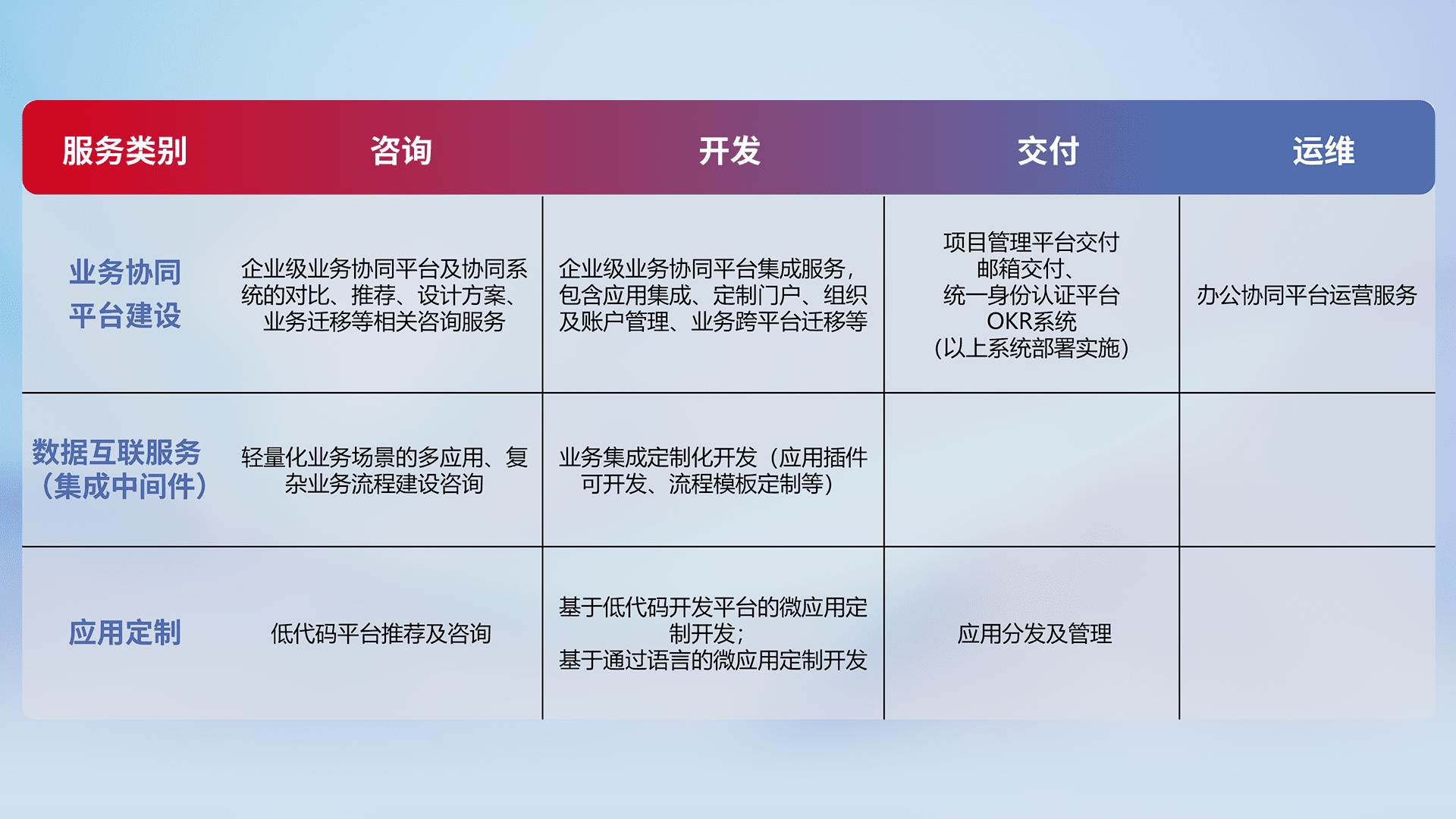 针对钉钉、、、企微、、、、IDaas等平台级产品提供产品的规划、、方案、、、、交付、、、、定制化开发等服务,,,,实现如统一协同办公、、、智能客户服务、、、、混合会议管理、、智能数据查询、、等业务场景,,,,实现数字化转型。。。